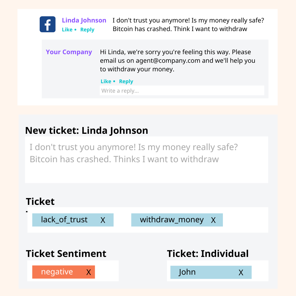 Analysing the sentiments of social comments such as "I don't trust you anymore! Is my money really safe? Bitcoin has crashed. Think I want to withdraw", and turning them into appropriate tickets can help you step up your game when your customers begin to lose trust in your brand.