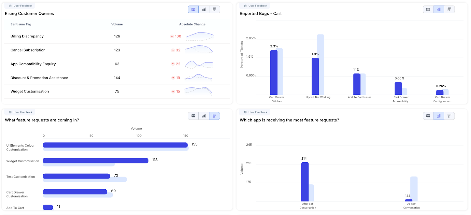 Unlike legacy tools that just flag a problem, SentiSum's AI-Native Voice of Customer platform uncovers the real, context-driven reason behind customer friction from 100+ sources, including support platforms like Zendesk, Freshdesk, Dixa, Intercom, and Gorgias, plus review sites, social media, surveys, live chat, and voice calls.