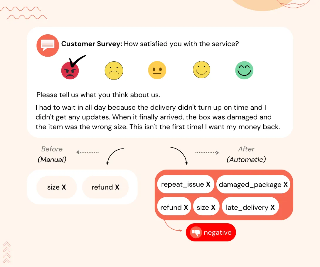 Get the volume, intent, sentiment and topic of each and every survey free text field — based on meaning not keywords.