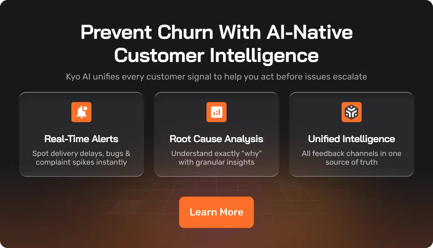 - AI & NLP Capabilities – Look for tools that can automatically categorize feedback, detect sentiment, identify root causes without manual tagging, and ability to detect churn risk early.